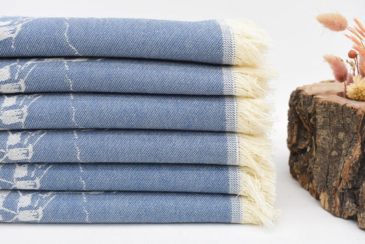 Blue Hand Tea Towel Organic Turkish Cotton Scene Patterned Tea Towel - 75 CM X 50 CM