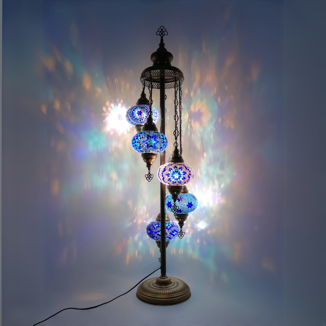 Elevate your space today. Featuring 5 handcrafted glass globes in beautiful mosaic patterns, you can personalize your lamp by choosing from our exclusive catalogue. Enjoy the elegant and warm glow of vintage Turkish glass, all showcased on a sleek brass colored stand.