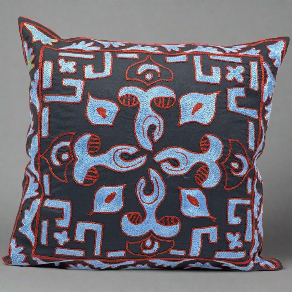 Suzani Cotton Pillow 50x50 CM 20"x20" - Black Red Corners