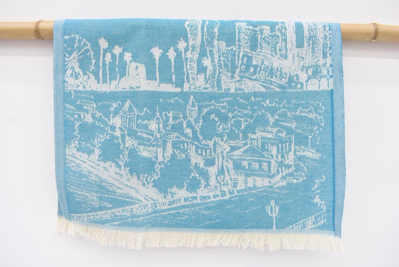 Turquoise Hand Tea Towel Organic Turkish Cotton Scene Patterned Tea Towel - 75 CM X 50 CM